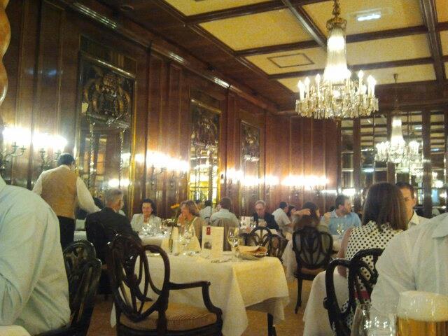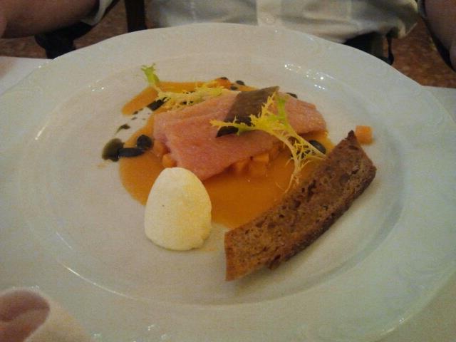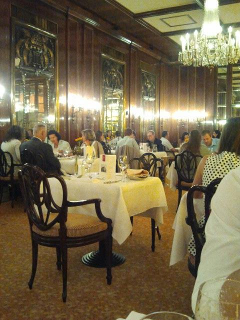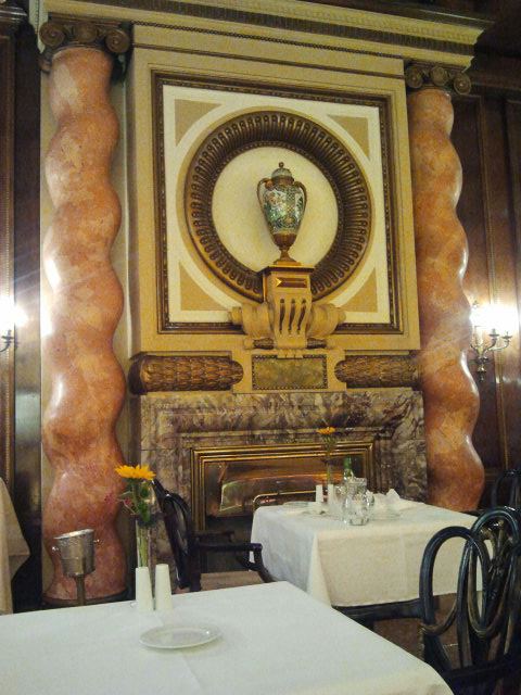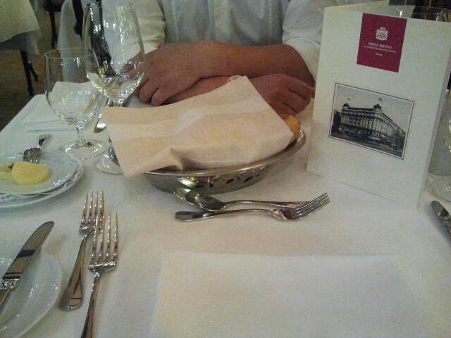 Man wird vom Türsteher, Portier, Rezeptionist, Restaurantleiter herzlichs begrüßt, keine Anzeichen von Hochnäsigkeit – das hat mich wirklich postiv überrascht. Das Restaurant ist in dunklem Holz gehalten mit viel Marmor an den Wänden. Leicht schrummig leuchten die Kronleuchter. Manchmal hätte ich fast vergessen, dass Mittag ist, weil die Stimmung eher an ein Abenddinner erinnert hat.