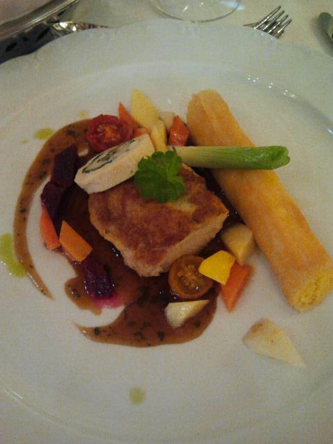 Zweierlei vom Perlhuhn mit jungen Rüben, Trüffel-Polentastangerl und Kerbeljus