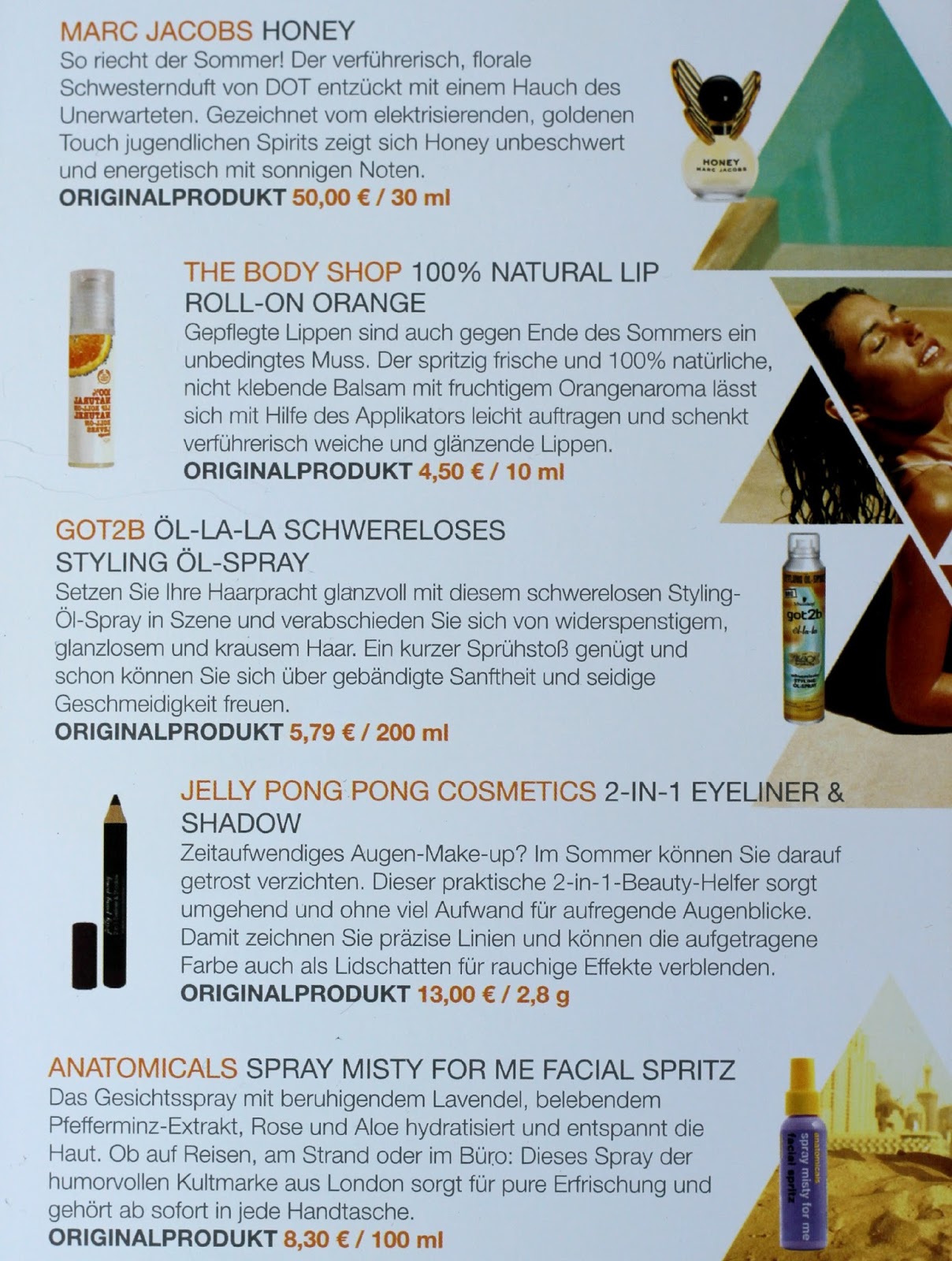 Wie bei der letzten Box auch, bin ich von dieser wieder begeistert. Das got2be Styling Öl-Spray interessiert mich am meisten und wollte ich mir schon öfters kaufen (war aber dann doch immer zu geizig dafür). Die Produkte passen sehr gut zum Motto, wie ich finde. Das Parfum ist sehr schön und für Sammler ist der Flakon sicher ein Highlight. Der Lipbalm schützt die zarte Lippenhaut. Der Spray riecht wirklich sehr gut und ich habe ihn schon in meine Tasche gesteckt.